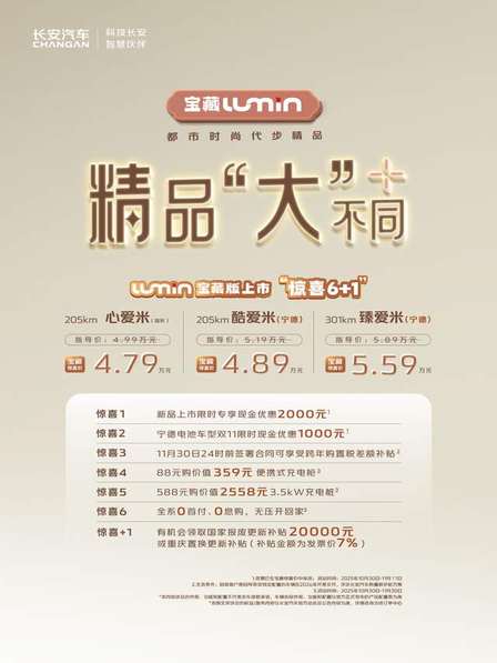 10月30日,都市时尚代步精品,Lumin宝藏版正式上市,共推出心爱米、酷爱米、臻爱米三个配置,官方惊喜价4.79万-5.59万。为回馈用户,Lumin同步推出极具诚意的“惊喜6+1”大礼,购车门槛大幅降低。