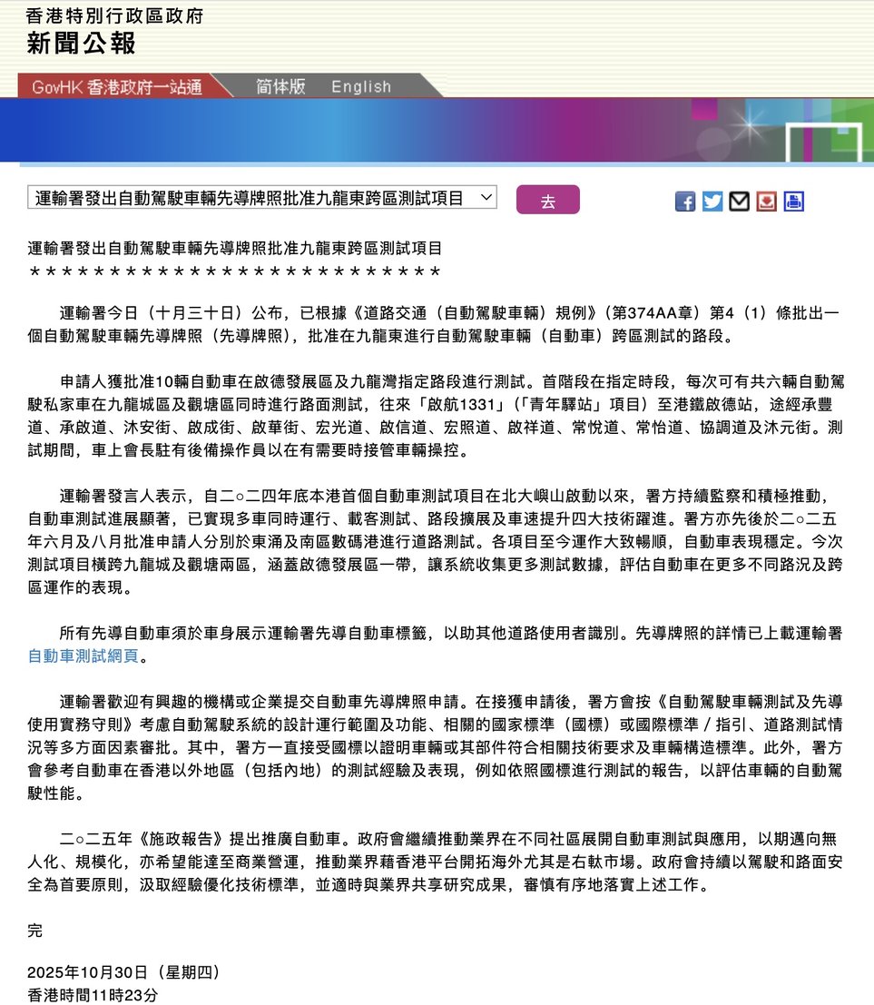 10月30日,香港特别行政区运输署发布消息称,已根据《道路交通(自动驾驶车辆)规例》批准萝卜快跑在九龙东(启德发展区及九龙湾指定路段)进行自动驾驶车辆跨区测试。