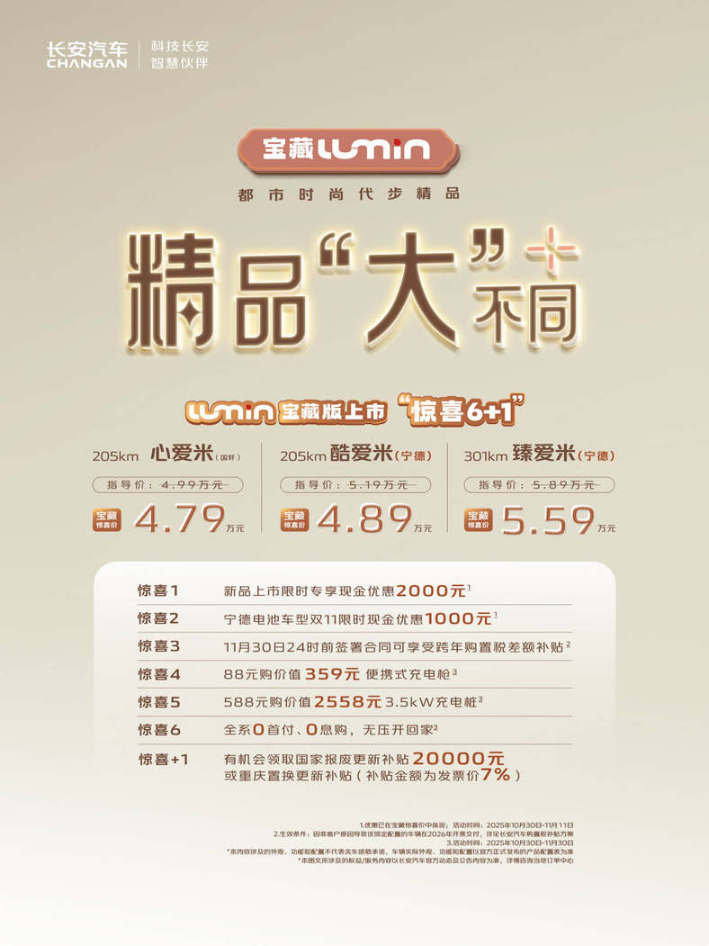 10月30日,都市时尚代步精品,Lumin宝藏版正式上市,共推出心爱米、酷爱米、臻爱米三个配置,官方惊喜价4.79万-5.59万。为回馈用户,Lumin同步推出极具诚意的“惊喜6+1”大礼,购车门槛大幅降低。