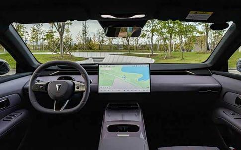 新车的内饰非常简洁,没有过多的点缀和实体按键,采用了经典的T字形布局,三幅式方向盘呈现为椭圆形,配备了滚轮和按钮两种调节方式。新车没有配备液晶仪表,而是用50英寸的AR-HUD所代替,不过显示效果异常清晰。而中控上的大尺寸中控大屏成为了科技上的亮点,下方则为空调出风口。