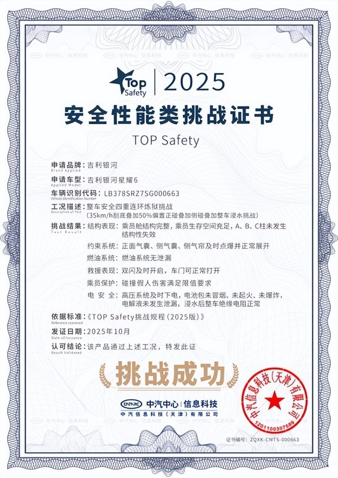 近期,吉利银河星耀6一次性通过中汽中心举办的行业首个超国标整车安全四重连环炼狱挑战,包括速度超现行标准16%的正面刮底碰撞、60km/h偏置正面碰撞、2.1倍国标能量的侧面碰撞及3倍国标深度的浸水测试,全面验证了从电池安全到车身结构稳定性的全维度安全实力,展现出在极端复合风险场景下的高安全冗余。