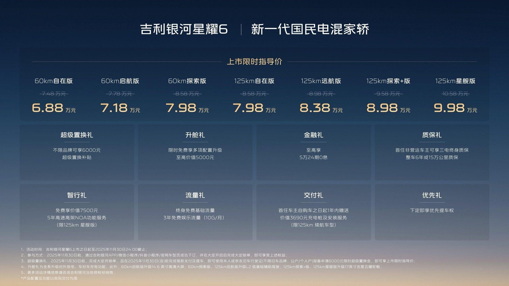 10月30日,新一代国民电混家轿吉利银河星耀6全球上市。新车共推出60km自在版、60km启航版、60km探索版、125km自在版、125km远航版、125km探索+版、125km星舰版7个版型,上市限时指导价为6.88万元-9.98万元。