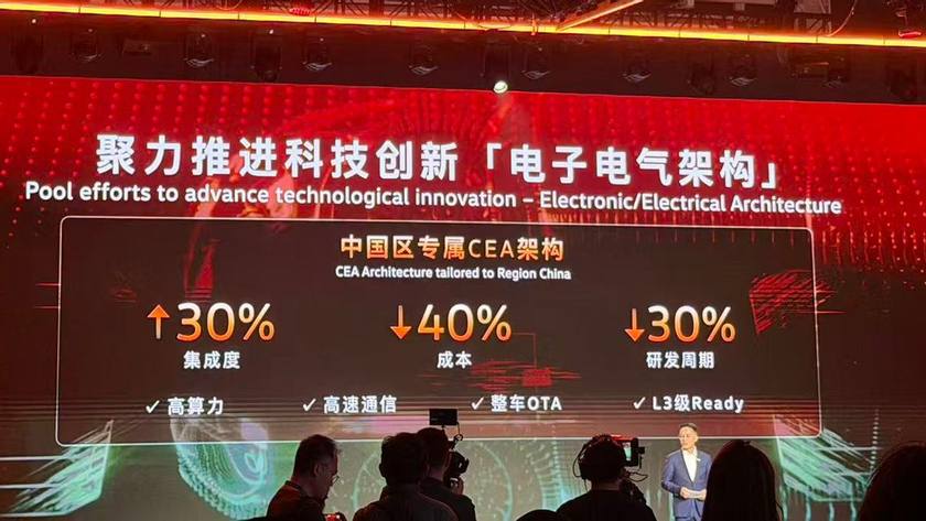 100亿元的研发数字,有机会发挥出远超数字本身的威力。譬如在具体技术规划上,一汽-大众将在中国分别采用专用的CEA电子电气架构,架构集成度将提升30%,成本下降40%,研发周期缩短30%,具有高算力、高速通信、整车OTA、准L3辅助驾驶能力。