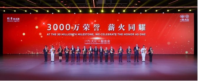 3000万辆,承载了3000万个梦想,凝聚着3000万份信任!在一汽-大众历任总经理的共同见证下,政府及股东领导对一汽-大众产销突破3000万辆表示热烈祝贺,并对公司成立34年来取得的辉煌成就给予充分肯定。