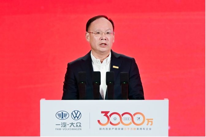 中国一汽董事长、党委书记邱现东在致辞中表示,今年恰逢中欧建交50周年,一汽-大众第3000万辆整车下线,更具有重大的时代意义。这一历史性成就和标志性事件,充分彰显了中国对外开放的强大活力,有力诠释了我国超大规模市场的独特优势,生动反映了中德汽车产业合作的深厚潜力,鲜明体现了我国市场化、法治化、国际化的一流营商环境。一汽-大众产销突破3000万辆,必将为深化中欧经贸合作、推动全球特别是中国汽车产业高质量发展注入新动能。一汽-大众成为国内首家跨越3000万辆的乘用车企业,这份成就根本在于坚持和加强党的全面领导,归功于中德双方始终如一的并肩共进,归功于广大用户一路相伴的深情厚爱,归功于全体伙伴风雨同舟的鼎力支持,归功于全体员工勠力同心的艰苦付出。中国一汽将全面贯彻党中央“扩大高水平对外开放,开创合作共赢新局面”战略部署,深入落实习近平总书记视察一汽重要讲话精神,持续深化与大众汽车集团的合作共赢、双向赋能,发挥各自优势,大力推进自主、合资一体化研发,整车、总成、生态一体化布局,努力将一汽-大众建设成为新时代汽车产业高质量发展和高水平对外开放新标杆,为建设汽车强国、促进经济社会发展、服务构建新发展格局作出新的更大贡献。