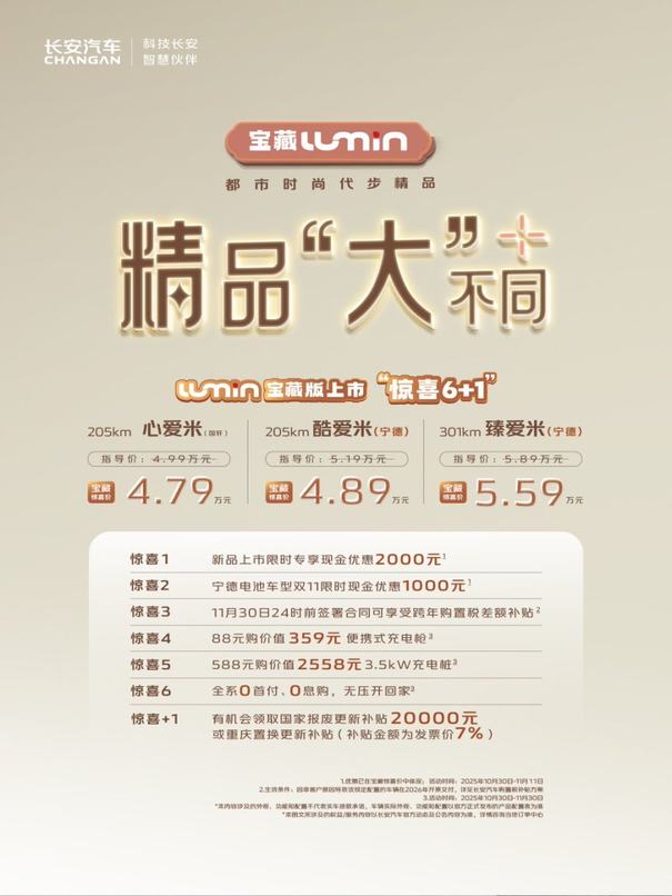 10月30日,都市时尚代步精品,Lumin宝藏版正式上市,共推出心爱米、酷爱米、臻爱米三个配置,官方惊喜价4.79万元-5.59万元。为回馈用户,Lumin同步推出极具诚意的“惊喜6+1”大礼,购车门槛大幅降低。