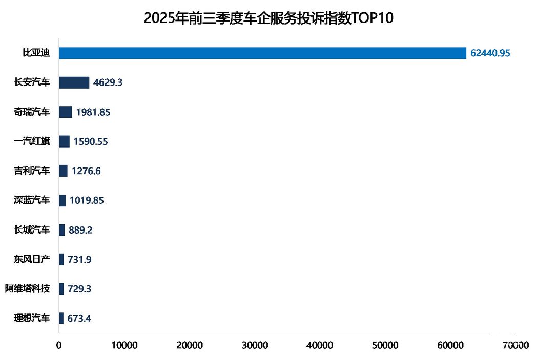 其实,看到这张图大家就已经说明了很大问题。从图标来看,今年前三季度,比亚迪服务投诉指数高达62440.95,其一家服务投诉指数占比就接近70%。