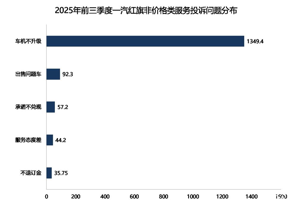 若抛开价格因素,一汽红旗拍到了今年前三季度服务投诉榜单的第四位。从投诉构成来看,车机不升级成了最大推手。今年前三季度,一汽红旗的车机不升级投诉指数达到了1349.4。