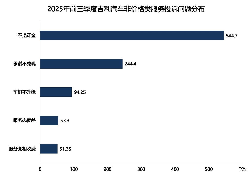 今年前三季度,吉利的服务投诉主要来自不退订金和承诺不兑现两大问题。其中,不退订金成了吉利服务的最大槽点。若以剔除迭代降价的服务投诉指数计算,吉利不退订金的投诉占比达到了45%。当然,吉利汽车的不退订金问题投诉中,更多是因为银河多款车型长时间无法交车,用户不想等车引起。对于用户和热销的吉利而言,这都是个苦恼。