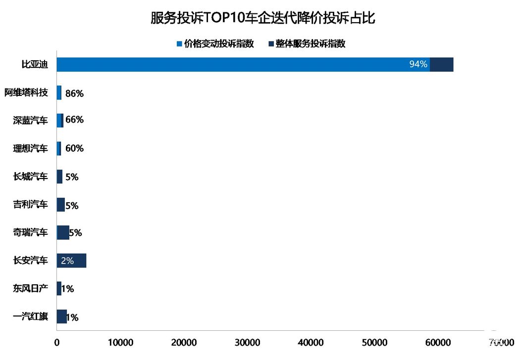 造成这一奇怪现象的成因,在于新车迭代和价格变动。服务类投诉TOP10榜单的迭代降价投诉占比图显示,比亚迪今年前三季度迭代降价引发的投诉指数占比高达94%。与此同时,阿维塔科技的迭代降价相关投诉指数也高达86%;深蓝汽车和理想汽车的迭代降价投诉指数也都超过了60%。