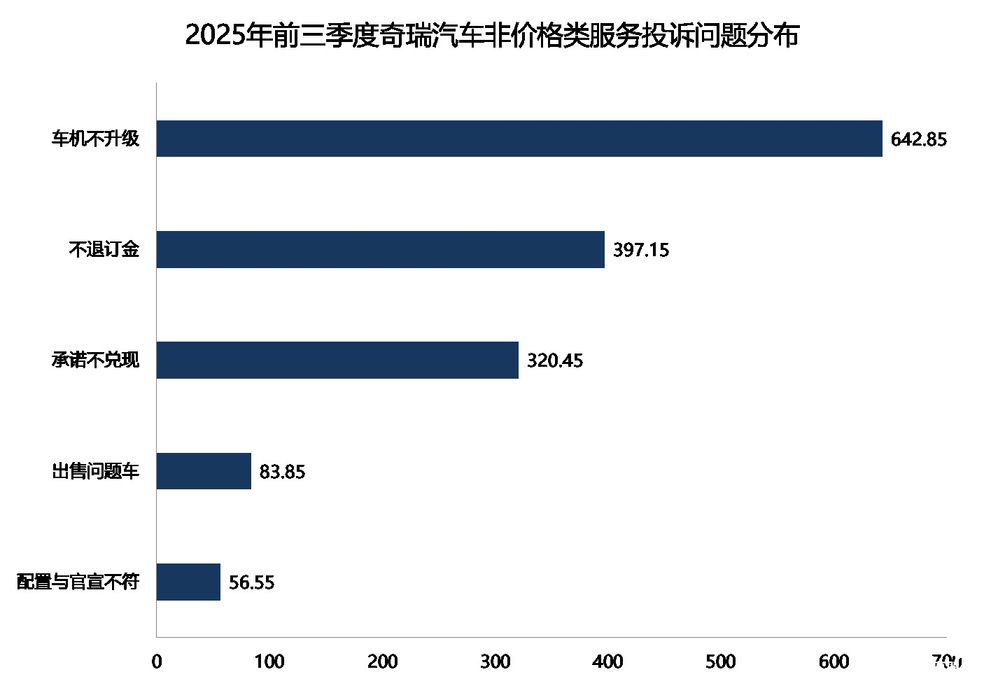 奇瑞非价格服务问题大体与比亚迪类似,大部分投诉都围绕车机不升级、承诺不兑现和不退订金三个问题。