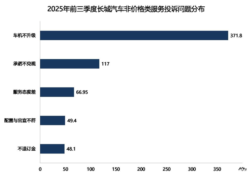 相比于前面的几大本土车企,销量更低的长城汽车服务投诉指数也更低。从投诉指数构成来看,车机不升级成了长城汽车投诉率最高的服务类问题。承诺不兑现问题紧随其后,但投诉指数也不高。