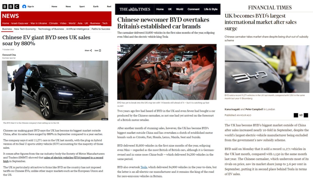 图2:英国广播公司(BBC):中国电动汽车巨头比亚迪在英国销量激增880%图3:《泰晤士报》:中国新晋品牌比亚迪超越英国老牌汽车品牌图4:《金融时报》:英国销量飙升,成为比亚迪最大的国际市场