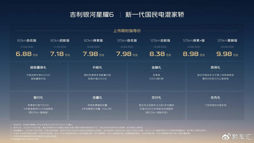 10月30日,吉利银河旗下全新电混家轿——星耀6正式全球上市,共推出7款配置车型,限时指导价6.88万元至9.98万元。新车不仅以极具竞争力的价格切入主流市场,更以“三大最省成本”和“四大越级满配”重新定义了“国民家轿”的价值内涵。此外,用户在11月30日前下单并锁单,还可享受6000元超级置换金以及包括升舱礼、金融礼、质保礼等在内的七重购车权益,进一步降低了用户的购车门槛。