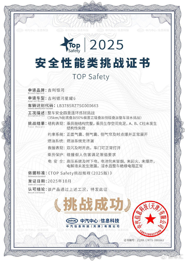 在中汽中心举办的“四重连环炼狱挑战”中,星耀6一次性通过包括60km/h偏置碰撞、3倍国标浸水等极端测试,展现出在全维安全上的高冗余设计。此外,在第三方媒体“玩车报告”的实测中,车辆经历高空坠落与极速穿墙后仍保持结构完整,电池与车门功能正常,验证其在真实事故中的高保护能力。