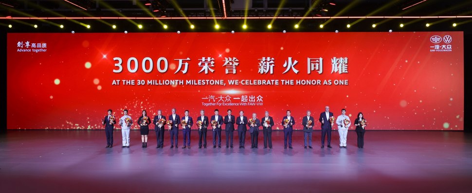 3000万辆,承载了3000万个梦想,凝聚着3000万份信任!在一汽-大众历任总经理的共同见证下,政府及股东领导对一汽-大众产销突破3000万辆表示热烈祝贺,并对公司成立34年来取得的辉煌成就给予充分肯定。