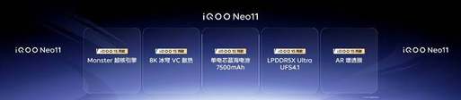 iQOO Neo11 搭载由骁龙 8 至尊版与自研电竞芯片 Q2 组成的“旗舰电竞双芯”,并在 Monster 超核引擎支撑下,带来优秀的 1% Low 帧表现、全新升级的 PC 级 2K 纹理超分、原生级 144FPS 无损超帧以及超分超帧并发,实现行业领先的游戏视效;更以 8K 冰穹 VC 液冷散热、7500mAh 超薄蓝海电池、AR 增透膜等多项 iQOO 15 同款配置、高质感金属玻璃机身和 IP68 & IP69 防尘防水等,共筑一款更优秀的强悍标准版。