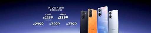 iQOO Neo11 共有 5 个版本可供选择,12GB+256GB 版本售价 2699 元(首销限时到手 2599 元);16GB+256GB 版本售价 2999 元(首销限时到手 2899 元);12GB+512GB 版本售价 2999 元;16GB+512GB 版本售价 3299 元;16GB+1TB 版本售价 3799 元,即刻下单,享更多权益。