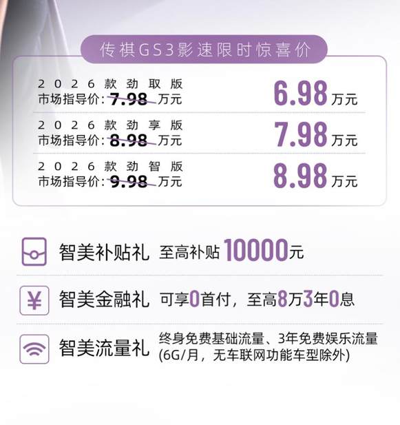 传祺GS3影速此次推出年度小改款,核心目标在于提升销量。新车共推出3款车型,限时惊喜价6.98-8.98万元,较现款同配置车型直降6000元,加上“至高8万3年0息”金融礼,进一步降低入手门槛。此外,新车还升级了智能化配置,强化了产品实力。