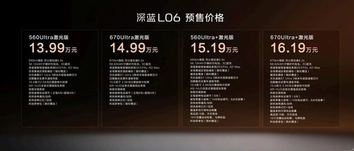 深蓝L06此次共推出四个配置版本,分别为560Ultra激光版13.99万元、670Ultra激光版14.99万元、560Ultra+激光版15.19万元、670Ultra+激光版16.19万元。