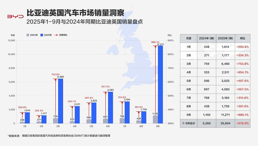 2025年9月,比亚迪在英国市场的乘用车销量达到了11271辆,同比增长880%,环比增长541%。今年前九个月,比亚迪汽车在英累计销量达到35604辆,同比增长576.9%,全市场销量超越了特斯拉、Mini等一众知名汽车品牌同期在英国的销量。