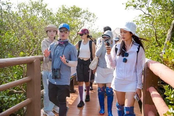 接着,众人来到广东湛江高桥红树林。这里是广东湛江红树林国家级自然保护区的核心地带,是我国大陆连片面积最大的一片红树林,汇集了木榄、红海榄等多种红树植物,也为众多滨海生物提供了理想家园。招潮蟹高举红螯在洞口巡视,弹涂鱼借助胸鳍奋力跳跃,鼓虾螯足开合发出清脆的“哒哒”声,整片滩涂洋溢着蓬勃的生命活力。不远处,专家指向更广阔的海域介绍,红树林远处的海域也是“海中大熊猫”中华白海豚重要的觅食场和栖息地。作为第十五届全运会吉祥物的原型,中华白海豚的畅游正是对这片海域生态健康的最佳认证。