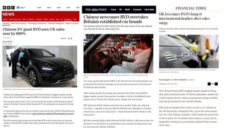 比亚迪在英国市场的高速增长,也吸引了英国主流媒体的高度关注。英国广播公司(BBC)报道“中国电动汽车巨头比亚迪9月英国销量创下新高”;《泰晤士报》则以“中国新晋品牌比亚迪超越英国老牌汽车品牌”为题,指出“两年前英国几乎没人听说过比亚迪”;《金融时报》更进一步强调“英国成为比亚迪最大的国际市场”。