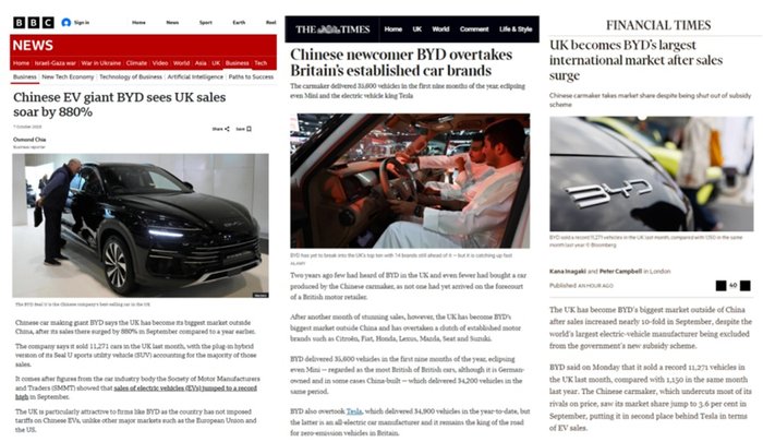 比亚迪在英国市场的高速增长,也吸引了英国主流媒体的高度关注。英国广播公司(BBC)报道“中国电动汽车巨头比亚迪9月英国销量创下新高”;《泰晤士报》则以“中国新晋品牌比亚迪超越英国老牌汽车品牌”为题,指出“两年前英国几乎没人听说过比亚迪”;《金融时报》更进一步强调“英国成为比亚迪最大的国际市场”。