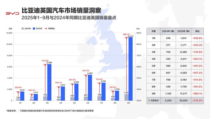 2025年9月,比亚迪在英国市场的乘用车销量达到了11271辆,同比增长880%,环比增长541%。今年前九个月,比亚迪汽车在英累计销量达到35604辆,同比增长576.9%,全市场销量超越了特斯拉、Mini等一众知名汽车品牌同期在英国的销量。
