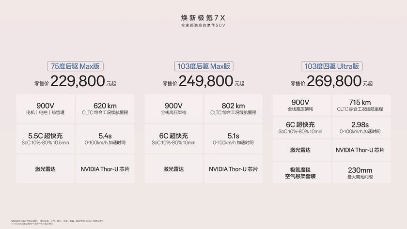 焕新极氪7X在高价值、好口碑的基础上,在空间、性能、安全、智能四大维度豪华进阶,全系搭载900V电机、电控及热管理系统,全系标配5.5C或6C超快充,全系标配激光雷达及算力高达700TOPS的Thor-U辅助驾驶芯片,全系标配137项豪华配置,重塑全球家庭豪华SUV新标杆。