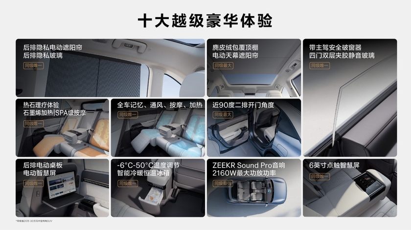 豪华MPV级的后排。基于SEA浩瀚架构而来的焕新极氪7X,实现了同级领先的83.34%得房率, 后排腿部空间达到同级最大的1187mm。同级最大905L后备厢空间以及同级最多的40处魔法储物空间,让生活收纳随心所欲。同级唯一的二排可移动滑轨、近90°二排最大开门角度等巧思设计,让儿童座椅拆装与抱娃上下车轻松自如。同时在配置层面,焕新极氪7X给后排家人带来豪华MPV 级的奢享体验,新增同级独有的石墨烯加热以及热石理疗功能,更集合电动躺椅、电动腿托、电动遮阳帘、电动桌板、后排电动智慧屏、后排中央扶手6英寸点触智慧屏等越级豪华配置于一体。