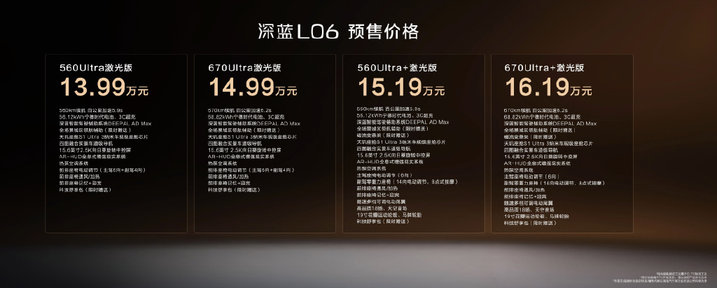 深蓝L06已正式开启预售。新车共推出四款配置车型:560Ultra激光版预售价13.99万元、670Ultra激光版预售价14.99万元、560Ultra+激光版预售价15.19万元、670Ultra+激光版预售价16.19万元,预售权益至高可享价值80259元。