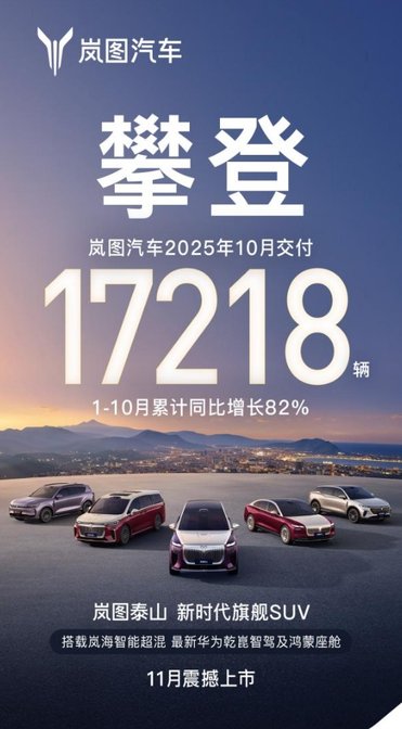 【2025年11月1日,武汉】11月1日,岚图汽车公布10月交付数据。10月,岚图汽车交付17218辆,再创历史新高;1-10月累计同比增长82%,实现稳健“九连涨”,彰显出强劲的增长动能与发展潜力。作为央企国家队,岚图汽车以“产品+资本”双轮驱动,正全力冲刺30万辆新里程,岚图梦想家、FREE+、知音在各自细分市场保持领先地位,岚图泰山、追光L双旗舰引爆市场期待,同时加速登陆资本市场,已向香港联交所递交上市申请,赴港上市进入实质阶段,全力打造央国企高端新能源第一品牌。