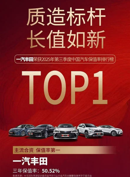 长期主义展示在一汽丰田在产品可靠性等关键领域下足了功夫,就如马拉松大赛对保障用车的首先要求就是要绝对安全可靠。成立22年来,一汽丰田始终坚守“品质保障”的金字招牌,将对品质的严苛管理注入每一个生产环节,不仅保证不良产品“不流向用户”,更严苛到不流入“下一个工序”。也因此,一汽丰田的每一款车都自带高品质、高耐久性、高可靠性的QDR属性,成为用户跨越时间周期的品质之选,并保持着极高的保值率,在贸促会汽车分会发布的2025第三季度汽车保值率排行榜中,一汽丰田以三年保值率50.52%的成绩,荣膺主流合资品牌第一名。