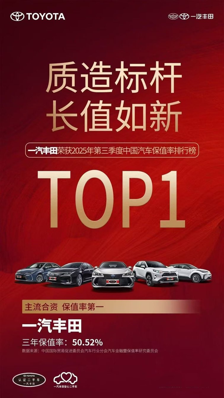 也因此,一汽丰田的每一款车都自带高品质、高耐久性、高可靠性的QDR属性,成为用户跨越时间周期的品质之选,并保持着极高的保值率,在贸促会汽车分会发布的2025第三季度汽车保值率排行榜中,一汽丰田以三年保值率50.52%的成绩,荣膺主流合资品牌第一名。