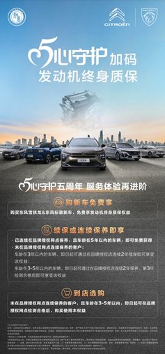 2020年,神龙汽车基于“良心车神龙造”的品质自信,在神龙汽车文化节正式发布“五心守护行动”,确保每位法系知音都能享受“买车放心、用车安心、服务贴心、换车开心、一路同心”的尊贵体验。2023年,五心守护行动升级,发布用户品牌“知音”,提出“五心守护伴知音”理念,不断推出各项客户关爱行动回应客户对高品质出行生活的期待,致力于与客户成为交心的知音伙伴。值此“五心守护”发布五周年之际,神龙汽车于11月1日再度加码,正式推出“发动机终身质保”政策,进一步深化与用户的“知音”伙伴关系,彰显其坚守品质、共筑信赖的坚定决心。