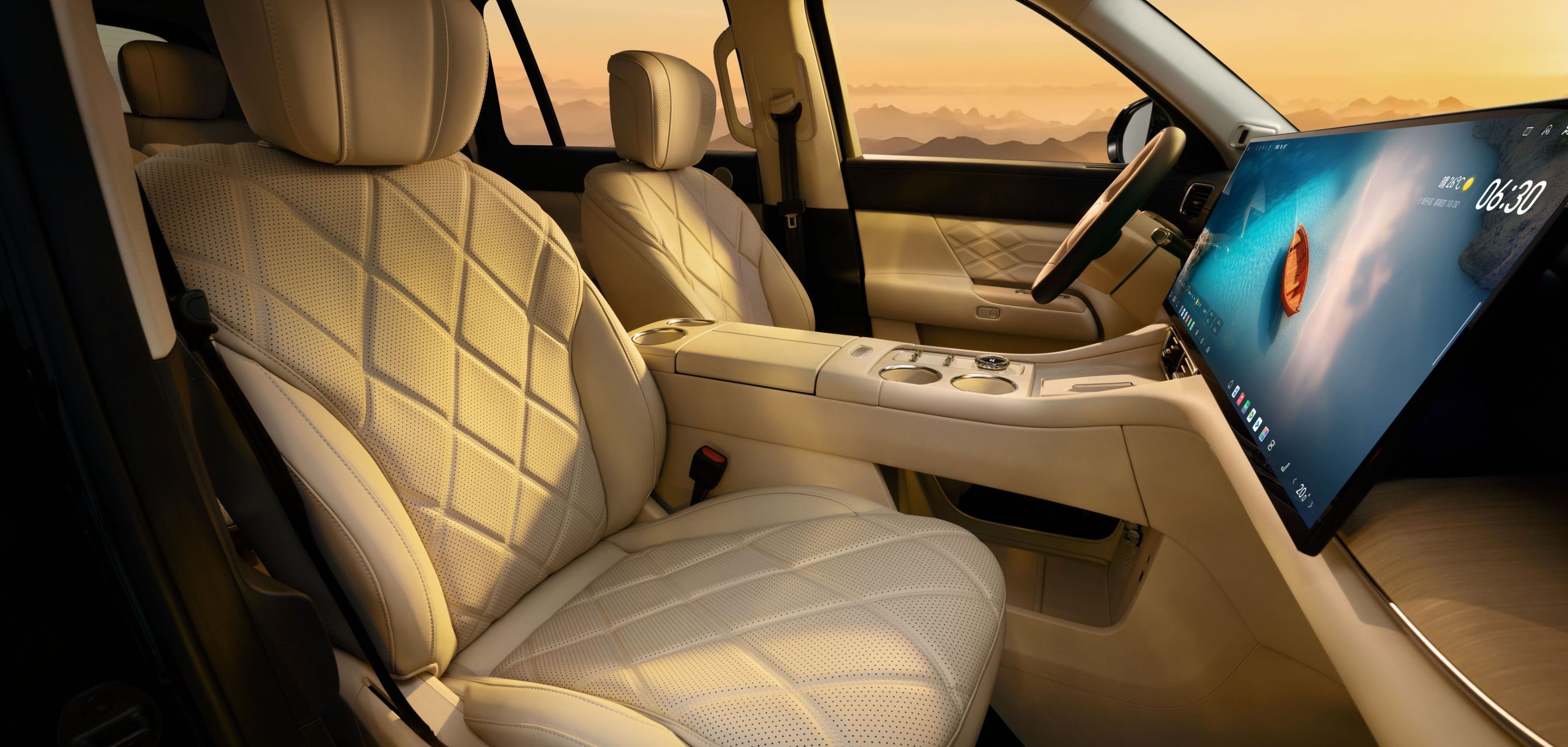 除了车身结构外,全车还配备11个安全气囊。首先,在后挡风玻璃处设有专属气囊,面积达0.64平方米,为第三排乘客提供独有的后方保护;第二排左右侧均配备长达2.2米的侧气帘,与第二排座椅两侧的腰部防护气囊共同形成保护层;第一排主副驾驶位均设有防腰部侧气囊,搭配方向盘主气囊及主驾驶膝部气囊;针对副驾前方大屏的设计,特别采用了跃屏式安全气囊,遇险时气囊能越过屏幕同时保护设备和乘员;此外,在主副驾驶之间扶手箱位置还设有双枪式远端安全气囊,能在侧碰时有效避免前排两人头部相互碰撞。