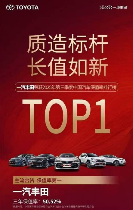 长期主义展示在一汽丰田在产品可靠性等关键领域下足了功夫,就如马拉松大赛对保障用车的首先要求就是要绝对安全可靠。成立22年来,一汽丰田始终坚守“品质保障”的金字招牌,将对品质的严苛管理注入每一个生产环节,不仅保证不良产品“不流向用户”,更严苛到不流入“下一个工序”。也因此,一汽丰田的每一款车都自带高品质、高耐久性、高可靠性的QDR属性,成为用户跨越时间周期的品质之选,并保持着极高的保值率,在贸促会汽车分会发布的2025第三季度汽车保值率排行榜中,一汽丰田以三年保值率50.52%的成绩,荣膺主流合资品牌第一名。