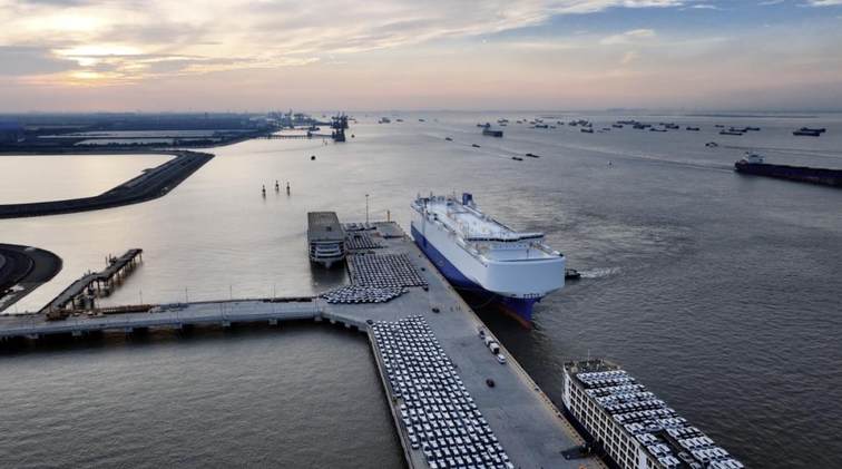 图为上海海通国际汽车码头,奇瑞出口车辆整装待发