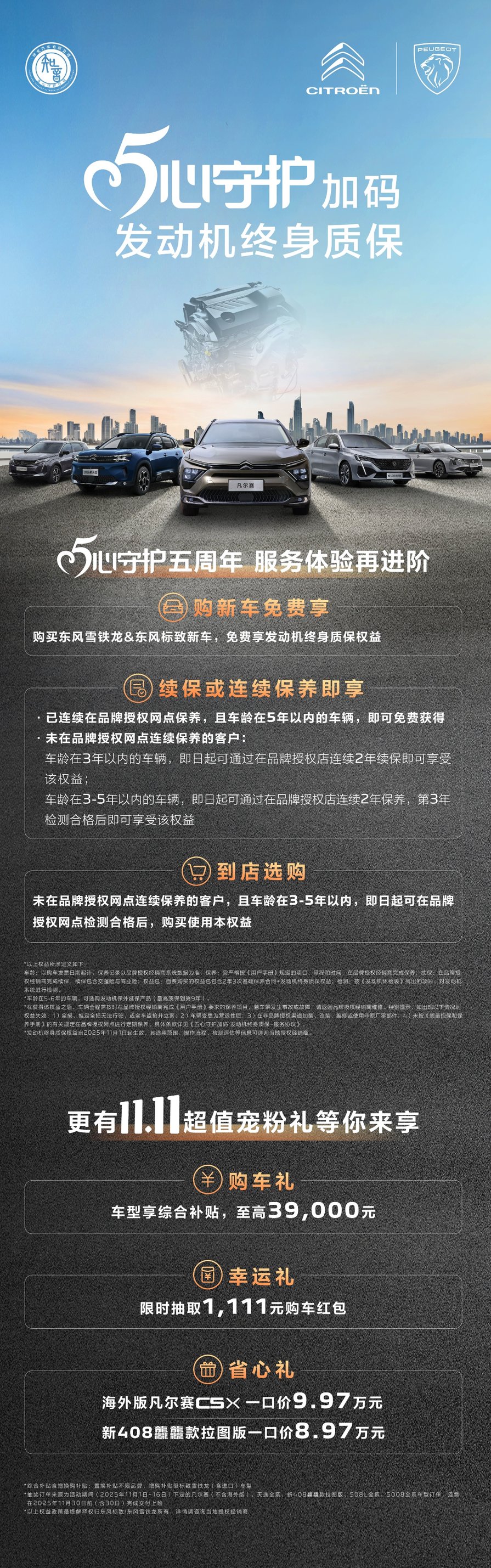 值此“五心守护”发布五周年之际,神龙汽车于11月1日再度加码,正式推出“发动机终身质保”政策,进一步深化与用户的“知音”伙伴关系,彰显其坚守品质、共筑信赖的坚定决心。