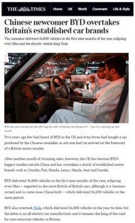 比亚迪在英国市场的高速增长,也吸引了英国主流媒体的高度关注。英国广播公司(BBC)报道“中国电动汽车巨头比亚迪9月英国销量创下新高”;《泰晤士报》则以“中国新晋品牌比亚迪超越英国老牌汽车品牌”为题,指出“两年前英国几乎没人听说过比亚迪”;《金融时报》更进一步强调“英国成为比亚迪最大的国际市场”。