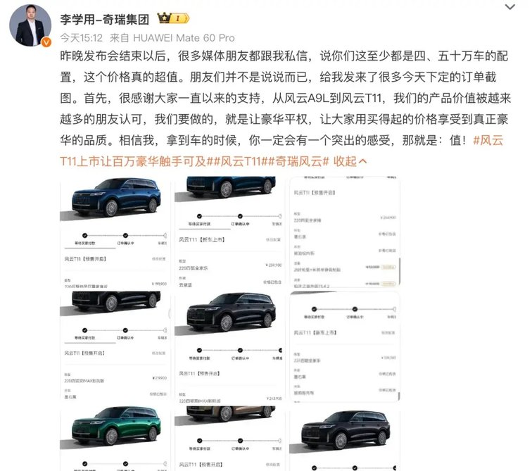 奇瑞汽车集团副总经理、奇瑞汽车股份有限公司常务副总经理李学用连发多条动态分享用户的热情,他表示:“相信我,拿到车的时候,你一定会有一个突出的感受,那就是:值!”。