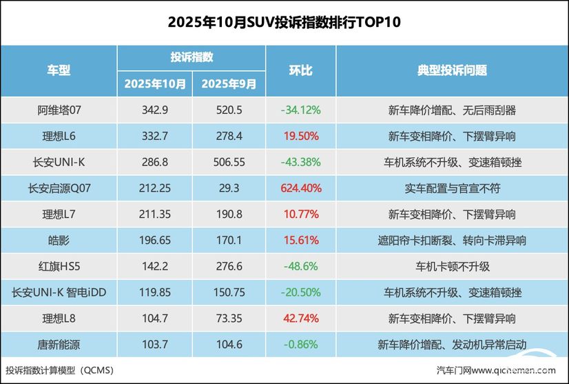 2025年10月SUV投诉指数排行:某车型再次夺冠
