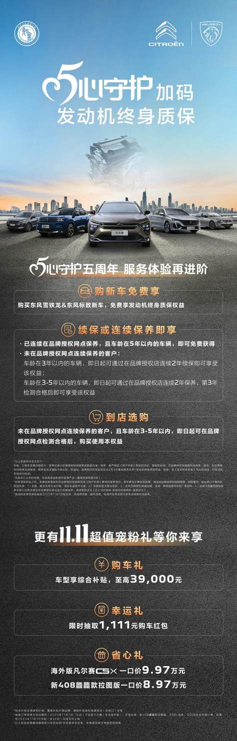 此次发动机终身质保政策的推出,不仅是神龙汽车对“良心车”品质底气的又一次证明,更是其面向未来、与用户建立终身信赖关系的战略举措。金秋11月,神龙汽车的品牌活力将持续迸发。不仅有“法式驾控体验季-赛道体验”等热血赛道活动,还将在“双十一”期间,通过“双11直播购”的直播专场,限时抽取购车抵扣券等福利,为用户带来极具吸引力的福利,让东风雪铁龙和东风标致的产品魅力,转化为用户触手可及的“高品价比”惊喜。