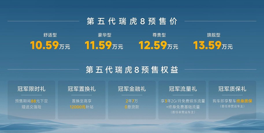 这几天,汽车圈的朋友都在讨论一款新车——第五代瑞虎8。这款刚刚开启预售的“豪华大五座家庭SUV”,以10.59-13.59万元的亲民预售价,带来了不少惊喜。