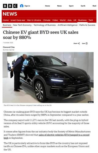 比亚迪在英国市场的高速增长,也吸引了英国主流媒体的高度关注。英国广播公司(BBC)报道“中国电动汽车巨头比亚迪9月英国销量创下新高”;《泰晤士报》则以“中国新晋品牌比亚迪超越英国老牌汽车品牌”为题,指出“两年前英国几乎没人听说过比亚迪”;《金融时报》更进一步强调“英国成为比亚迪最大的国际市场”。