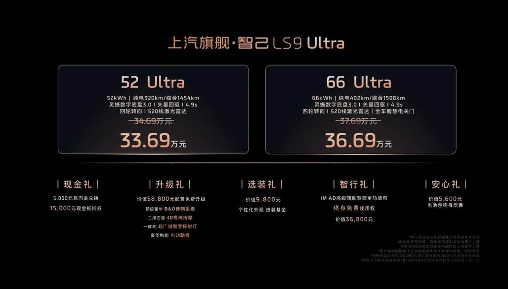 11月4日,上汽旗舰智己LS9全球首发并宣布正式开启预售,推出52 Ultra和66 Ultra两款超级增程版,预售权益价分别为33.69万元和36.69万元。作为上汽集团70年造车底蕴与全球顶尖技术融合的旗舰之作,智己LS9以跨代级技术实力与全面智能化体验,打破传统大六座SUV格局,展现出同级少有的科技厚度与豪华气场。