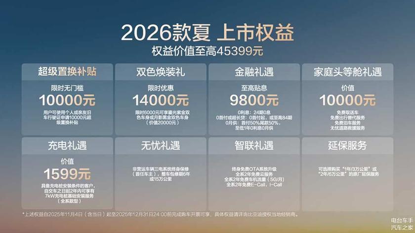 2025年11月4日,2026款夏正式上市,此次共推出4款车型,限时超级置换价19.68—25.98万元。仅需中级SUV的价格,就可享有超越30万级的豪华配置,2026款夏全能出行新选择!