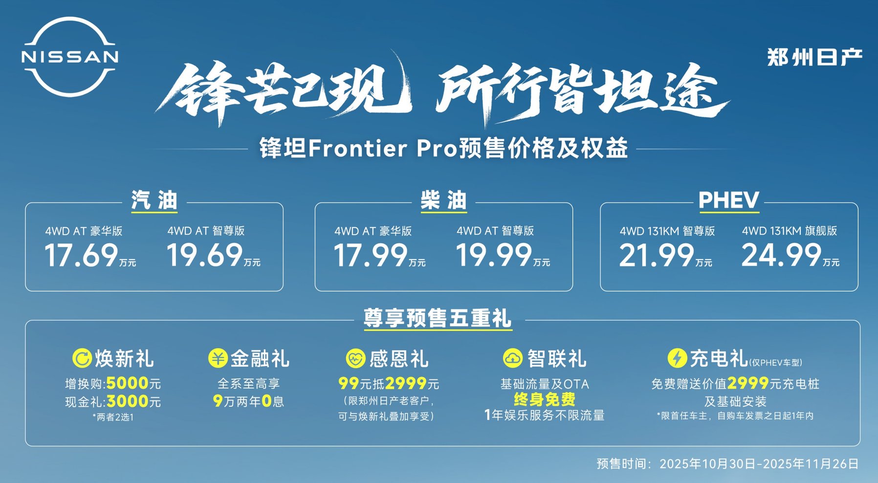 10月30日,郑州日产举办“锋芒已现 所行皆坦途——Frontier Pro预售暨品鉴交流会”,正式预售Frontier Pro,郑州日产党委书记姚利文公布Frontier Pro中文名“锋坦”。