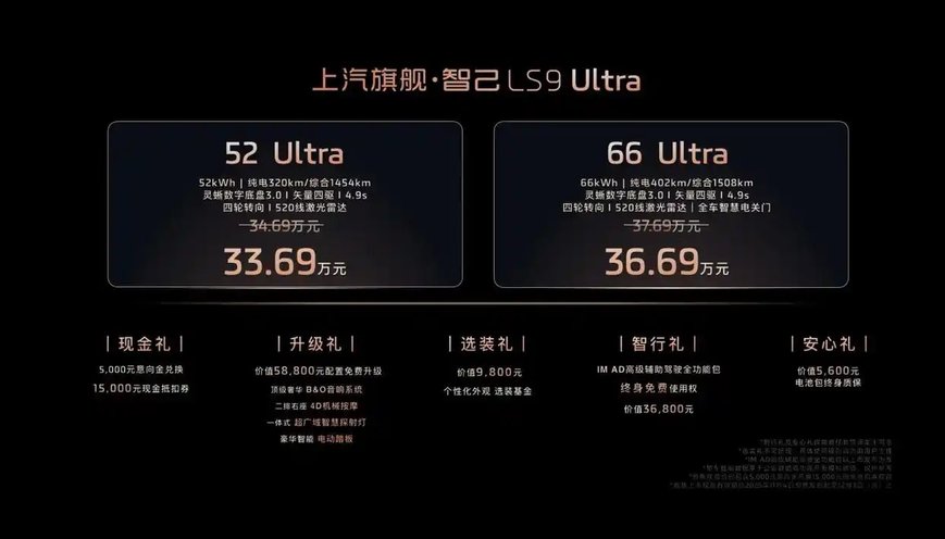 大家好,我是大李。11月4日,上汽旗舰智己LS9正式开启预售,新车首发两个超级增程版本:52 Ultra版,预售权益价33.69万元;66 Ultra版,预售权益价为36.69万。作为智己汽车的旗舰力作,LS9一举将全尺寸大六座SUV的价格门槛拉低至33万元级别,这无疑让理想L9和问界M9等同级选手倍感压力,接下来咱们就来具体聊聊。